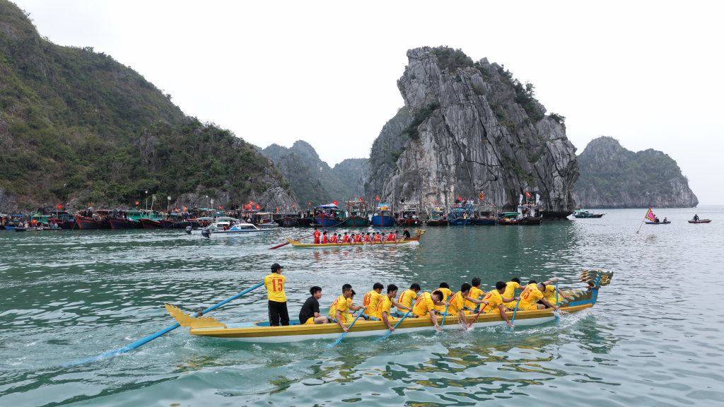 The traditional recreational activities of the festival took place in a lively atmosphere on the sandy beach in front of the temple, featuring traditional boat racing. Enthusiastic cheers and encouragement for the competing teams created a vibrant festival spirit, strengthening the bonds among fishing communities from Ha Long, Cat Ba, and Quang Yen.