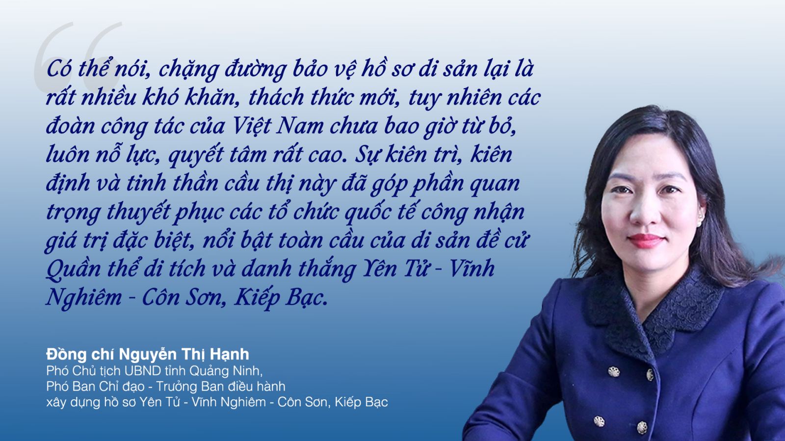 Đặc biệt, trong quá trình tiếp nhận khuyến nghị từ Trung tâm Di sản Thế giới (UNESCO) và Hội đồng Di tích và Di chỉ (ICOMOS), tỉnh Quảng Ninh đã chủ động xây dựng và gửi Báo cáo giải trình, bổ sung thông tin tới 04 lần vào tháng 11/2024, tháng 02/2025, tháng 4/2025 và tháng 6/2025. Sự kiên trì, kiên định và tinh thần cầu thị này đã góp phần quan trọng thuyết phục các tổ chức quốc tế công nhận giá trị đặc biệt, nổi bật toàn cầu của di sản.