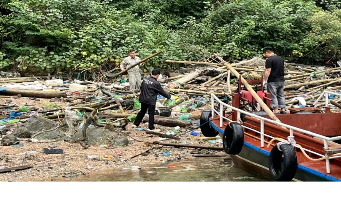 Cùng ngày, hoạt động thu gom rác trên mặt nước và chân đảo cũng được triển khai đồng loạt tại nhiều điểm khác trên vịnh như: Vông Viêng, Cửa Vạn, Hang Cỏ, Cống Đỏ... Kết thúc ngày công tác, các lực lượng đã thu gom được khoảng hơn 6m3 rác thải, chủ yếu là tre, bè mảng, phao xốp, dây thừng và các vật liệu trôi nổi khác bị sóng đẩy vào bãi cát, chân đảo.