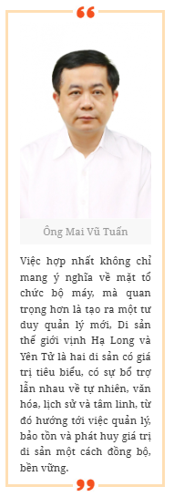 Ông Mai Vũ Tuấn: Việc thành lập Ban Quản lý Di sản thế giới vịnh Hạ Long - Yên tử trên cơ sở hợp nhất bộ máy của 3 đơn vị quản lý di sản, di tích trước đây chính là sự hiện thực hóa của mô hình “thống nhất quản lý”. Đây là bước chuyển quan trọng trong chiến lược bảo tồn và phát huy giá trị di sản tại Quảng Ninh, vừa giúp tinh gọn tổ chức bộ máy, chuyên nghiệp hóa, vừa tạo sự thống nhất trong hoạt động quản lý, bảo tồn, phát huy giá trị di sản…