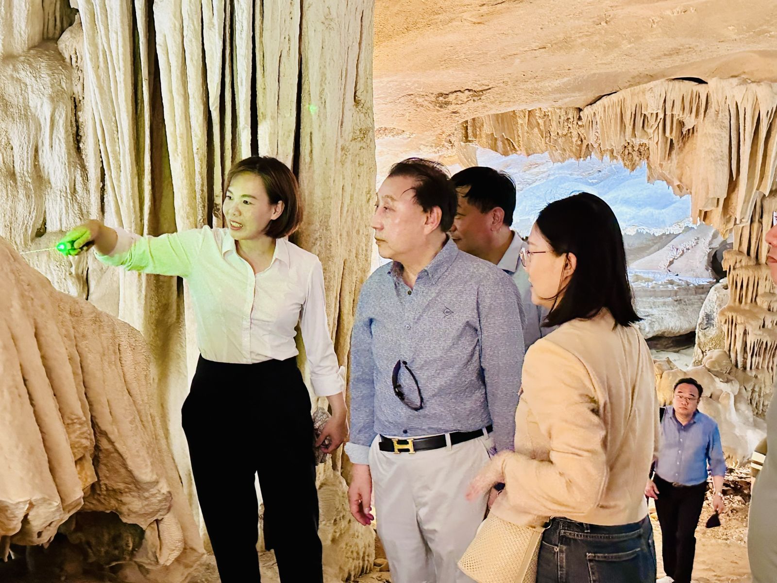 Ông Jung Dong Won, Chủ tịch Hội đồng Quản trị Tập đoàn SG nghe thuyết minh viên Ban Quản lý di sản thế giới vịnh Hạ Long – Yên Tử giới thiệu trong hang Thiên Cảnh Sơn