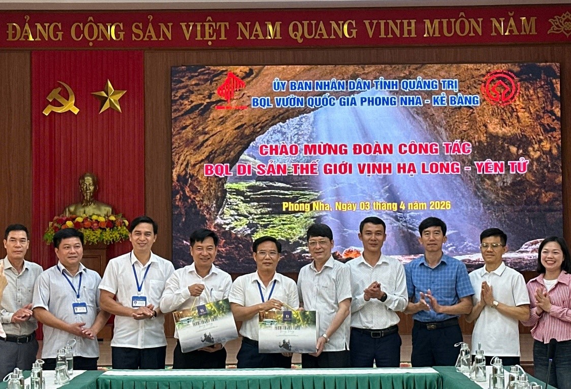 Trong khuôn khổ Kế hoạch tổ chức học tập thực tế, trao đổi kinh nghiệm tại di tích văn hóa lịch sử, di sản thế giới và danh lam thắng cảnh năm 2026, ngày 03/4, đoàn công tác của Ban Quản lý di sản thế giới vịnh Hạ Long – Yên Tử đã đến làm việc tại Phong Nha – Kẻ Bàng. Đây là hoạt động học tập tham quan thực tế nhằm nâng cao năng lực chuyên môn cho đội ngũ viên chức, người lao động (VC-LĐ) trong công tác bảo tồn và phát huy giá trị di sản.