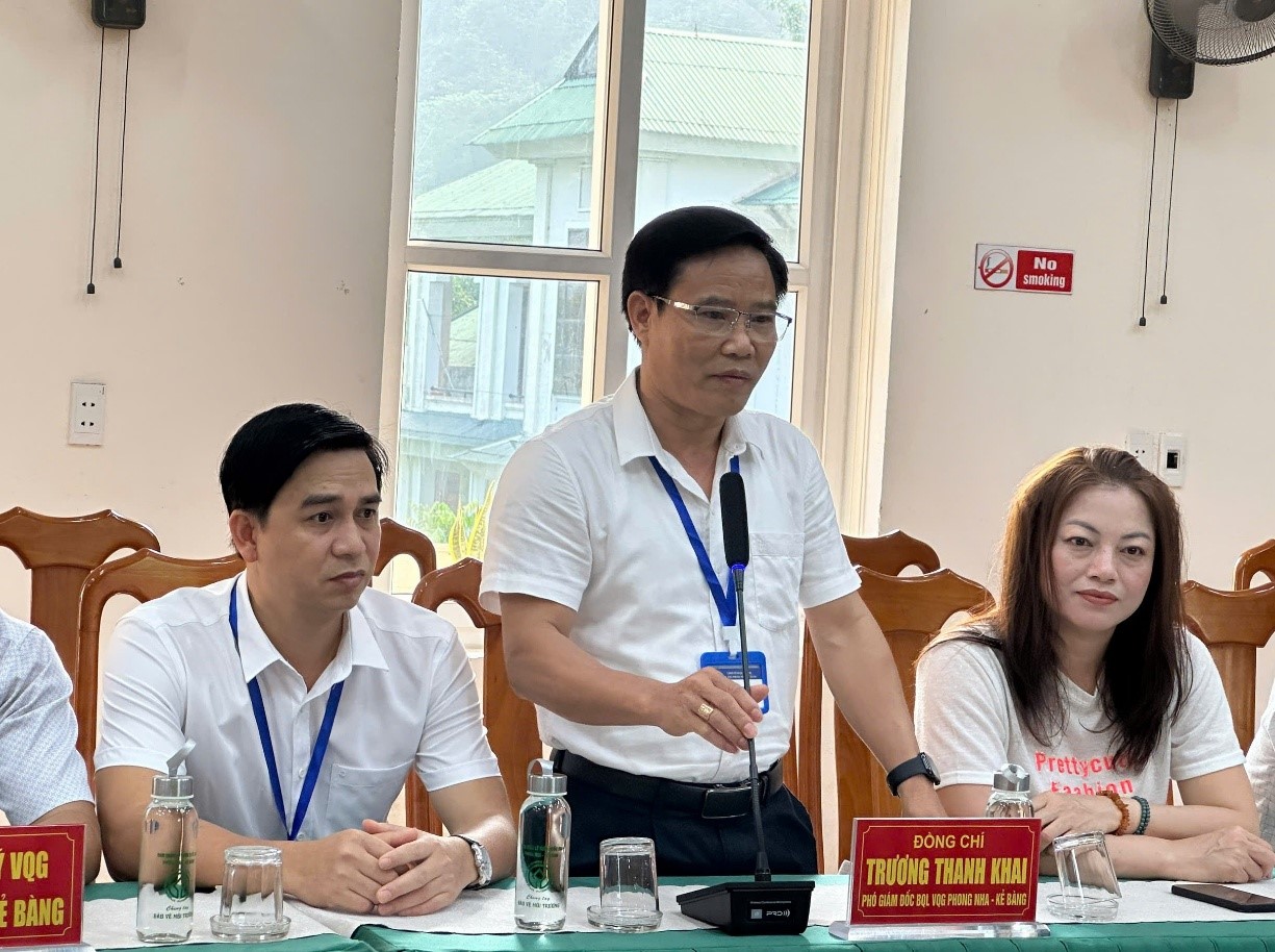 Trao đổi chuyên môn với đoàn công tác, đồng chí Trương Thanh Khai, Phó Giám đốc Ban Quản lý Vườn quốc gia Phong Nha – Kẻ Bàng, đã chia sẻ những kinh nghiệm thực tiễn về cơ cấu vận hành của Vườn Quốc gia, cung cấp thông tin chi tiết về tổng diện tích quản lý, các biện pháp kỹ thuật trong công tác bảo vệ nghiêm ngặt vùng lõi di sản và quy trình tổ chức, vận hành khoa học tại các điểm tham quan như Vườn thực vật, điểm động Phong Nha… để vừa đảm bảo đón tiếp khách tham quan hiệu quả, vừa giữ gìn nguyên vẹn giá trị thiên nhiên.