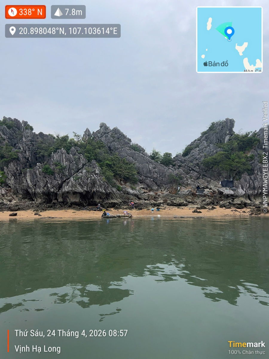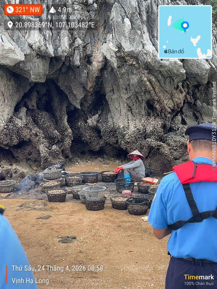 Cụ thể, vào khoảng 9h20, tại khu vực hòn Cò Lớn, Tổ công tác phát hiện hoạt động nuôi trồng thủy sản trái phép, cụ thể là nuôi ngao. Qua làm việc, chủ hộ là ông P.Đ.T (trú tại xã Nghi Dương, Hải Phòng) không xuất trình được giấy phép nuôi trồng do cơ quan có thẩm quyền cấp. Ông T cho biết đang nuôi khoảng 9.000 lồng ngao, với hệ thống cơ sở vật chất gồm 1 mảng tre diện tích khoảng 70m² đã treo giống ngao, 1 tàu vỏ gỗ mang BKS QN-3293TS và 1 tàu vỏ composit dài hơn 5m, không lắp máy, phục vụ sinh hoạt. Tổ công tác đã yêu cầu ông T chấm dứt ngay hoạt động nuôi trồng trái phép; đồng thời tháo dỡ, di dời toàn bộ cơ sở vật chất (trên vách núi và dưới mặt nước) ra khỏi khu vực vịnh Hạ Long.