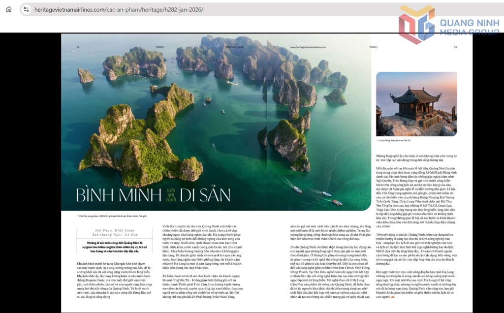 Trong số báo đầu tiên chào năm mới 2026, hình ảnh hùng vĩ, thơ mộng của Di sản thiên nhiên thế giới vịnh Hạ Long đã được lựa chọn làm ảnh bìa tạp chí Heritage của Hãng hàng không quốc gia Việt Nam (Vietnam Airlines).