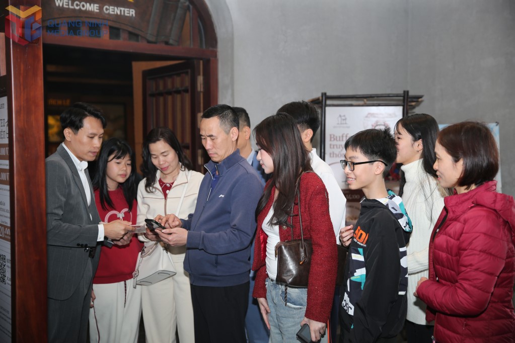 Nhân viên Công ty Cổ phần Phát triển Tùng Lâm hướng dẫn người dân cài đặt và đặt vé cáp treo trực tuyến, góp phần giảm thời gian chờ đợi và nâng cao trải nghiệm du xuân tại Khu di tích và danh thắng Yên Tử.