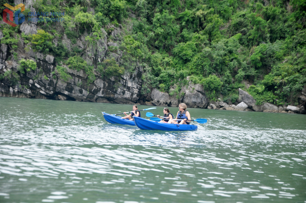 Du khách nước ngoài vui chơi, trải nghiệm chèo kayak trên Vịnh Hạ Long.