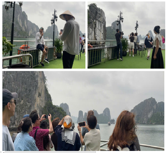 Đoàn nhà báo quốc tế chụp ảnh cùng hòn Trống Mái trên vịnh Hạ Long